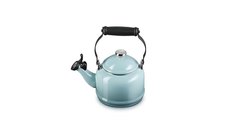 This Le Creuset tea kettle heats water quickly and evenly. Its sea salt color looks lovely on my stove. The metal finish feels strong and lasts through daily use. Whistling sound is clear and easy to hear from across the kitchen. The 1.25-quart size is perfect for making a few cups of tea. Cleaning is simple thanks to the smooth enamel surface. It sits well on both gas and electric stovetops. Handles stay cool, making it safe to pour without burns. A stylish and practical addition to any kitchen collection.