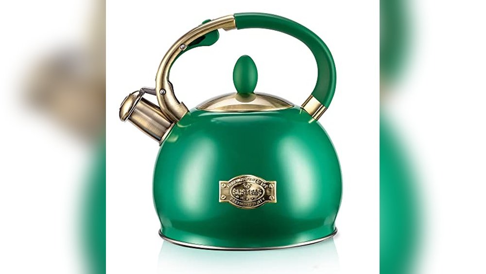 This SUSTEAS tea kettle is made of food-grade stainless steel for safe boiling. Its whistle alerts you when water is ready, so you never miss a boil. The cool touch handle stays comfortable to hold, even when the kettle is hot. A silicone pinch mitt is included for easy and safe handling. With a 2.64-quart capacity, it fits well for family or guests. The bright green color adds a fresh look to any kitchen.